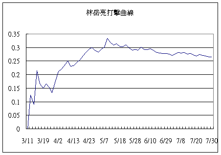 統計時間:中華職棒11年 第22週 7月31日到8月6日 【特別分析—游擊手對決】 游擊手是球隊重要的防線,在現代棒球之中,游擊手更要身兼強大的攻擊火力,如早年的鐵人小瑞普根(Cal Ripken Jr.)、現今重砲好手A-ROD(Alex Rodriguez)、基特(Derek Jeter)、曾在三商虎待過現在在美國大放異彩的魔拉、日職橫濱的石井琢朗,都是能攻善守的游擊好手,中華職棒也曾出過像葛雷諾這般攻擊型游擊手。打到11年,本土化的今天,四隊的游擊手也都練就一身攻擊本事,我們來比較看看這四位主力先發游擊的攻擊特色。 n 林岳亮 月亮是鯨隊打線中,少數能持續先發的球員,其他一干明星常常被李總叫去坐板凳或是因傷不能出賽,由於他持續穩定站穩先發及前段棒次,是可以安心選入的對象。 n 月亮對戰表現