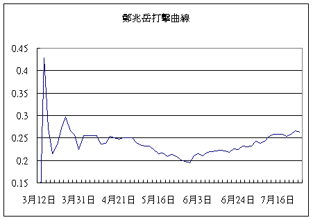 馮勝賢打擊率有明顯的高低潮走勢,現在正在一個低檔盤整階段,未來又有可能再往上衝到3成2,所以當他又進入高峰時決不要漏了他,你要是發生這種「失誤」那可比亞洲盃那球還糟糕了!(還是念念不忘…^_^) n 鄭兆岳 阿讓進入職棒很多球迷都不知道他功力有多少,後來加上當時牛隊極為中意的張家浩加盟,阿讓到季末能否持續站穩先發都令人懷疑,但阿讓展現出精彩的防守,並且下半季也狂飆出打擊成績,還列入上月MVP獎項的候選名單,由於他是四隊游擊當中最便宜的,要論本益比可不輸人。 n 阿讓對戰表現