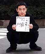 手持松阪所書「感謝您培育了我」之簽名板的上地 |