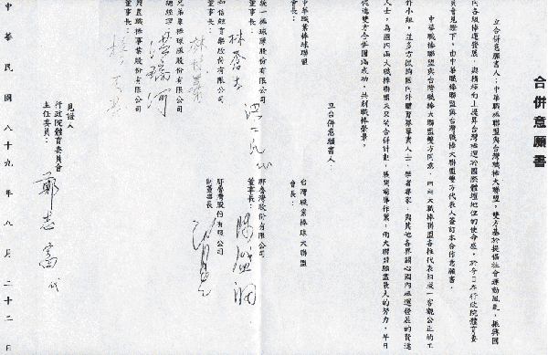 今天出席本次會議的有體委會鄭志富,林國棟,中華聯盟楊天發、洪瑞河、林博義、洪士民與李文彬,台灣大聯盟邱復生、陳盛沺、張信行與袁定文等11人。一行人先行在一樓闢室密談,會談結束後隨即上12樓召開記者會,正式宣佈兩聯盟正式簽署『合併同意書』。展開兩聯盟和解的開始。