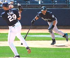 西雅圖水手外野手鈴木一朗,美國時間1日(日本時間2日)以「一棒右外野手」身份於球隊首場熱身賽中先發出場,第一打席便自教士投手Karl手中擊出中外野安打。