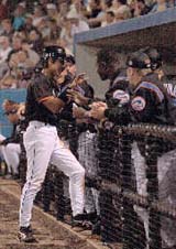 | 新庄奔回本壘後,與隊友互相道賀 |
