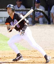 紐約大都會外野手新庄剛志,美國時間3日(日本時間4日)以「六棒右外野手」身份先發出場,並在一局一出局三壘有人時的第一打席,以左外野適時安打締造個人在熱身賽的第一支安打,與第一分打點。