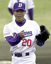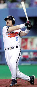 ![¤»¦^ùؤ@¦º¡Bクルーズが¢±¥´®u³s続のバックスクリーンへのソロを©ñつ¡]§ë¤â・´ç辺«T¡^](../../images/2001NPB/2001-0307Cruz.jpg) |