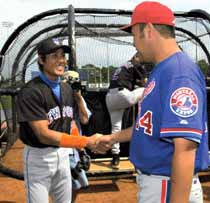 紐約大都會外野手新庄剛志,與蒙特婁博覽會投手伊良部秀輝,美國時間18日(日本時間19日)於熱身賽中遭遇,新庄自伊良部手中擊出2支安打。這也是大聯盟史上首次出現日本投手與日本野手的對決。