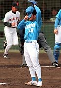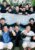 (前排中央為松板,右為渡邊監督,左為小倉棒球社長) |